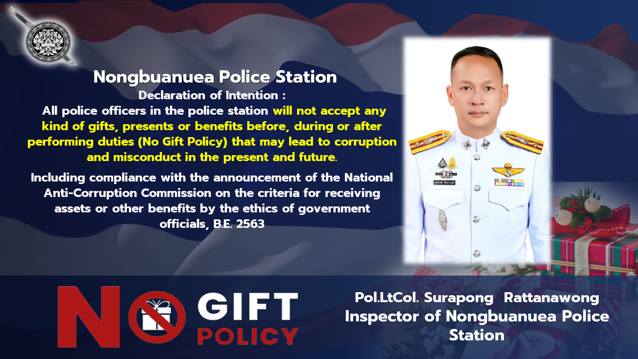 สถานีตำรวจภูธรหนองบัวเหนือ มีความมุ่งมั่นในการพัฒนาการดำเนินงานให้เป็นไปอย่างโปร่งใส ยึดถือ ประโยชน์ส่วนรวมมากกว่าประโยชน์ส่วนตัว ไม่มีผลประโยชน์ทับซ้อน สอดคล้องตามแผนการปฏิรูปประเทศด้านการป้องกันและปราบปรามการทุจริตและประพฤติมิชอบ (ฉบับปรับปรุง) ซึ่งมีวัตถุประสงค์ให้หน่วยงานมีการปฏิบัติงานด้วยความโปร่งใส ไร้ผลประโยชน์ เจ้าหน้าที่ของรัฐทุกคนไม่รับของขวัญและของกำนัลทุกชนิดจากการปฏิบัติหน้าที่ (No Gift Policy)