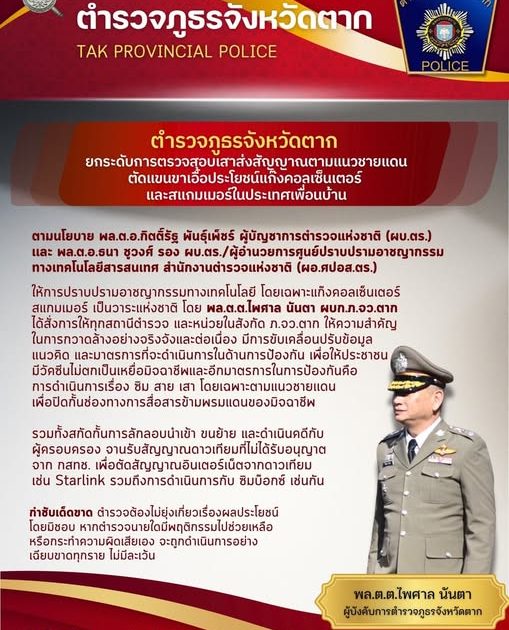 ตัดแขนขาเอื้อประโยชน์แก๊งคอลเซ็นเตอร์ 5 กุมภาพันธ์ 2569 โดย admin / ข่าวประชาสัมพันธ์,ข่าวฝากประชาสัมพันธ์ Post Views: 5 ตาก1 พล.ต.ต.ไพศาล นันตา ผบก.ภ.จว.ตาก ยกระดับการตรวจสอบเสาส่งสัญญาณตามแนวชายแดน ตัดแขนขาเอื้อประโยชน์แก๊งคอลเซ็นเตอร์ และสแกมเมอร์ในประเทศเพื่อนบ้าน ตามนโยบาย สำนักงานตำรวจแห่งชาติ เพื่อเผยเเพร่ตามช่องทางสื่อ social ของทุกหน่วย FacebookFacebookXTwitterLINELine