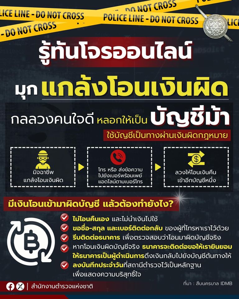 รู้ทันโจรออนไลน์ มุก “แกล้งโอนเงินผิดบัญชี” กลลวงคนใจดี หลอกให้เป็น “บัญชีม้า” มิจฉาชีพแกล้งโอนเงินผ