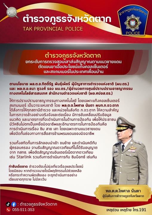 ตาก1 พล.ต.ต.ไพศาล นันตา ผบก.ภ.จว.ตาก ยกระดับการตรวจสอบเสาส่งสัญญาณตามแนวชายแดน ตัดแขนขาเอื้อประโยชน์