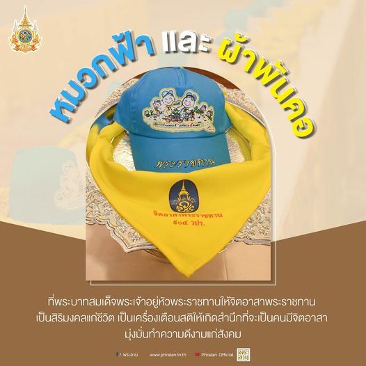พระบาทสมเด็จพระเจ้าอยู่หัว ทรงพระกรุณาโปรดเกล้าฯ พระราชทานหมวกฟ้า และผ้าพันคอให้กับประชาชนจิตอาสาที่
