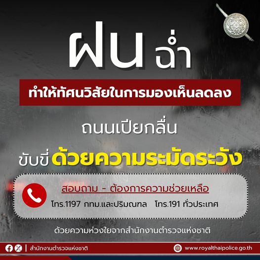 โปรดขับขี่ด้วยความระมัดระวังฝนตก ถนนเปียกลื่น และทำให้ทัศนวิสัยในการมองเห็นลดลงขับขี่ปลอดภัย ไม่ประม
