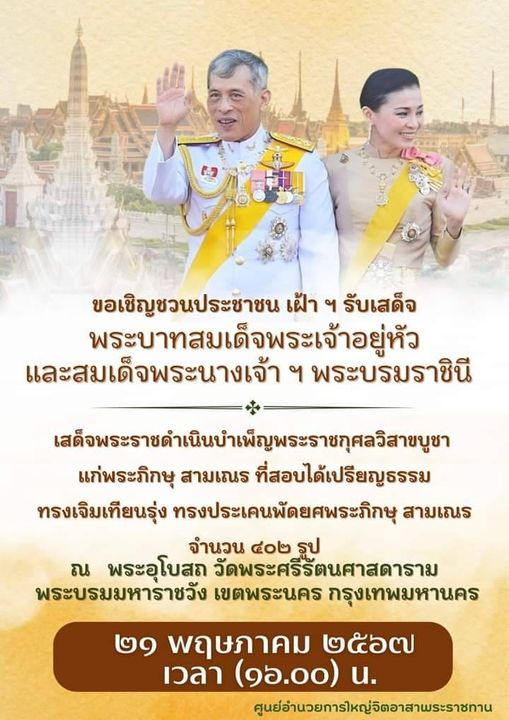 ขอเชิญชวนประชาชนร่วมเฝ้า ฯ รับเสด็จ พระบาทสมเด็จพระเจ้าอยู่หัว และสมเด็จพระนางเจ้าฯ พระบรมราชินี เสด
