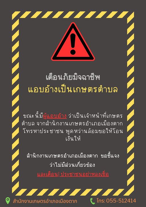 เตือนประชาชนอย่าหลงเชื่อขณะนี้มีผู้แอบอ้างเป็นเจ้าหน้าที่เกษตรตำบล โทรหาเกษตรกรและผู้นำชุมชนในพื้นที