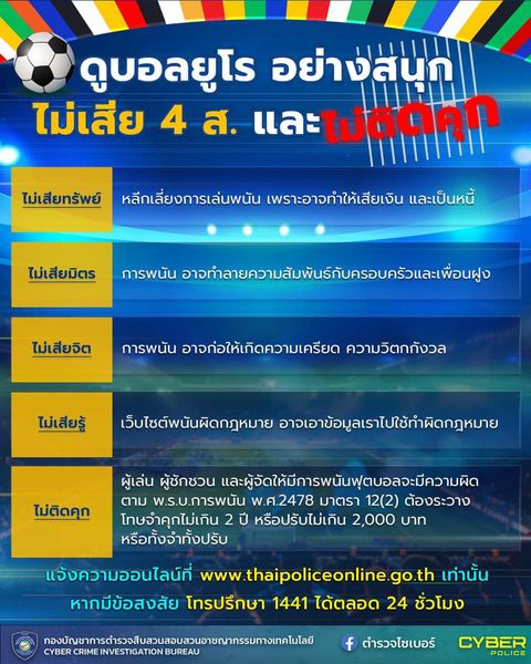 ตำรวจไซเบอร์เตือนภัยดูบอลยูโร อย่างสนุก ไม่เสีย 4 ส. และ ไม่ติดคุกตำรวจไซเบอร์อยากขอให้พี่น้องประชาช